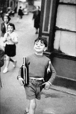 这张照片的题材并不重大,但却是布列松的一幅脍炙人口的名作。表现一个男孩:两只手里,各抱一个大酒瓶,踌躇满志的走回家去,好象完成了一个光荣而艰巨的 任务。照片中的人物,情绪十分自然真实,显示出布列松熟练的抓拍功夫。抓拍是布列松一生所坚持的基本手段。他从来不去干涉他的拍摄对象。
