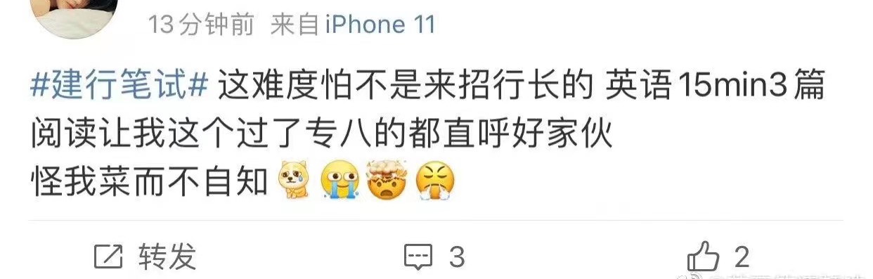 在建行笔试的当天,有网友评论:“这难度怕不是来招行长的,英语15分钟3篇阅读让我这个过了专八的都直呼好家伙。”还有网友感慨:“考了一本百科全书,三个小时抠掉了两个美甲。”